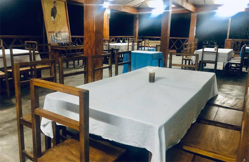 The Marangdut Jungle Camp is Bhutan first true jungle camp located near the sub-tropical forests of Royal Manas National Park. Situated next to the Marangdut tributary of the Drangme river, it comprises eight tented camps with comfortable and spacious individual tents for sleeping, modern bathroom and shower facilities, and a common dining area. All the structures are covered with thatched roof made in the traditional Khengpa style. In fact, old villagers from nearby Marangdut village helped us out with the traditional thatched roofing, a craft that has almost disappeared as corrugated iron sheet roofing has replaced thatch lately. The nearby forests and stream provide ample opportunities for a pleasant hike or a cool dip in the water. When in season, our kitchen staff will be most happy to make traditional delicacies out of local resources such as wild banana flowers, bamboo shoots and edible orchids and ferns. We also source our vegetables and food items locally where possible.